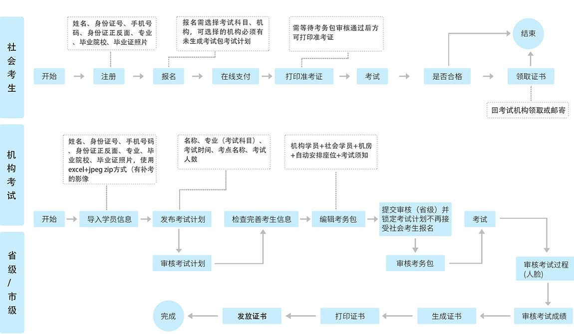 智慧考試系統(tǒng)主要是由考生端、考試端、機(jī)構(gòu)端、監(jiān)管端、管理端等組成,對(duì)線上考試進(jìn)行綜合管理的系統(tǒng)平臺(tái)。該平臺(tái)將考生培訓(xùn)、報(bào)名、繳費(fèi)、考試安排、考務(wù)管理等考試流程信息統(tǒng)一管理,并從各個(gè)維度幫助企業(yè)立體化分析考生考試等數(shù)據(jù),極大提升了考試流程的規(guī)范化、標(biāo)準(zhǔn)化、信息化,提升了考試效率,提升了考生的考試體驗(yàn)。