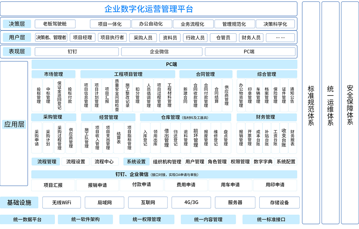 數(shù)字化管理系統(tǒng)對企業(yè)工程項目從項目投標(biāo)中標(biāo)、項目過程管理、合同管理、物資設(shè)備管理、采購管理、項目過程管理、施工隊管理、供應(yīng)商、成本核算等進(jìn)行全面綜合管理;縱向貫穿投標(biāo)、采購、施工、竣工的全過程,橫向涉及公司內(nèi)部的各相關(guān)崗位,是一套全方位、集成的企業(yè)項目綜合管理平臺。通過對成本、進(jìn)度、質(zhì)量、安全等方面的控制,以及對合同、結(jié)算、支付、資金等要素的管理,來提高工程類企業(yè)對工程項目的綜合配套能力。